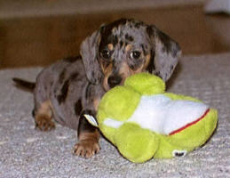 Hey, this month we're proud to present a real "hot dog" as our POM! Meet Paco, a daschund who's won the hearts of all his housemates and just may be able to win yours. Paco's shown here playing with his toy Ribbit, but he also spends his days chasing the household felines and trying to make friends with Joshua, the family's Golden Retriever. Yeah, it's a big happy family over there at Paco's, and that isn't even counting his two other petmates, PC and Sunni. What's 'PC' stand for? Check out Paco's site and find out for yourself!