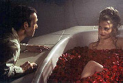 Fuzzydog Review: It's not easy trying to describe what American Beauty is about as a film. On one level, it simply feels like a dark, cynical and angry look into suburban American life today. With a host of dysfunctional, lonely and/or frustrated characters, it's easy to get put off by the atmosphere which this film sets, and it's easy to transfer one's dislike for certain characters into a general dislike of the film itself. Nope, American Beauty is definitely not a "feel good" film, choosing instead to be a subversively twisted caricature of suburbia today. At the same time, however, there's a significant part of American Beauty that seems to run purely at a comedic level, and, for the most part, it works. Credit here needs to go to Kevin Spacey for an amazing performance as the frustrated Lester Burnham, as well as to Annette Bening for some nice comedic turns as Burnham's status-seeking wife. Combined with some interesting writing, and more than a few creative touches by director Sam Mendes, this is a film that stays with you after you leave the theater, and for that it's certainly worth a look. Whether American Beauty is the film masterpiece that some have touted it to be is another issue altogether...you'll have to decide that one for yourself...